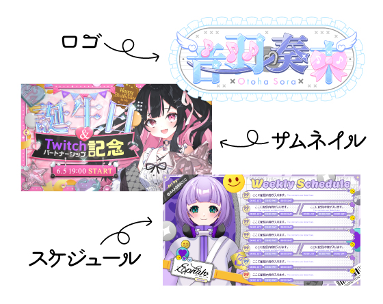 写真集・イラスト集/配信画面オーバーレイ/雑談・歌枠配信背景/自己紹介画像/スケジュール表/Xのヘッダー/YouTubeのチャンネルアート/告知画像/グッズ紹介画像/各ゲームのMAP隠し/グッズデザイン/おはVテンプレート/LINEスタンプ/立ち絵/この中にない物でもお気軽にご相談ください。
